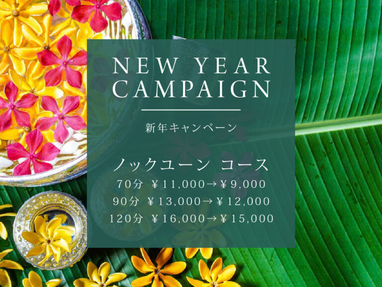 Sawadee Pi Mai (สวัสดีปีใหม่) Happy New Year. This is Nok Yung Thai Massage, located in Ueno and Okachimachi. At the beginning of a new year, why not take a special moment to restore balance to both body and mind? At Nok Yung, we have prepared a New Year 2026 Campaign to help you start the year in a healthy and refreshed state. The busy holiday season and winter cold often leave the body tense and fatigued without us realizing it.Our experienced therapists, trained in authentic Thai techniques, combine traditional stretching and acupressure in Thai massage to improve circulation and guide you into deep relaxation. In our calm and refined space, take time to reset your body and mind and welcome the new year with a light and refreshed feeling.We invite you to experience Nok Yung’s authentic healing during this special time. All of our staff sincerely look forward to welcoming